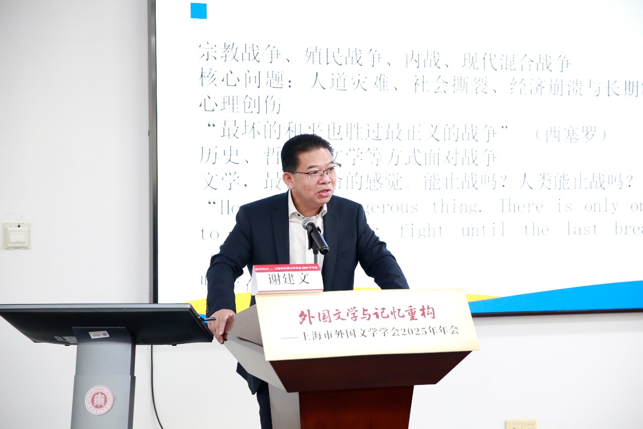 第一阶段的主旨报告由副会长、上海师范大学张静教授和白菜网全讯600胡学星教授主持。副会长、上海外国语大学谢建文教授以《另一个记忆的切口——马塞尔·拜尔<狐蝠>探析》为题,剖析了战争、记忆、声音与文学虚构之间的多重互动关系。谢建文教授认为,拜尔笔下的声音既是记忆的载体,也是重构历史的媒介,“声音档案”不仅再现了帝国末期德国生活轨迹的众声合唱,更在知识诗学的框架下,借助声学、解剖学等跨学科知识,构建了一个兼具身体性、反思性与象征性的叙事空间,最终在真实与虚构的张力中,展现了第三帝国历史记忆的面貌。